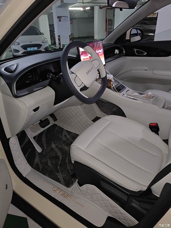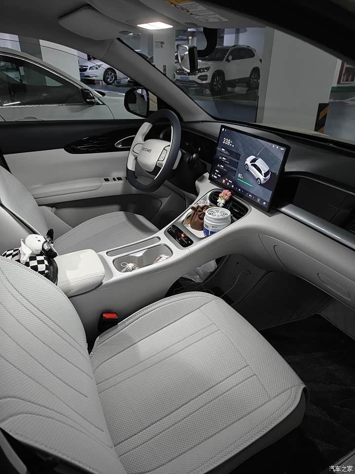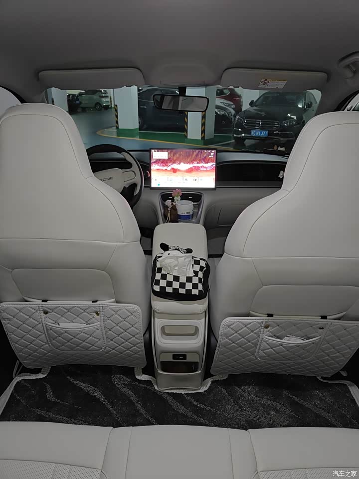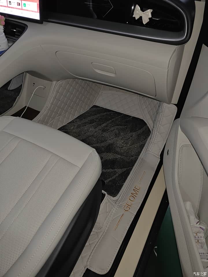 内饰也很满意,缺点是白色容易脏不好打理,所以我网购买了同款白灰色系皮质座椅套和全包脚垫,展示如上,确实精致了很多,对于我自己而言肯定比黑色更喜欢白色内饰啦