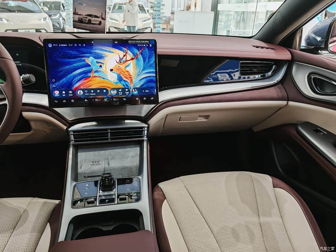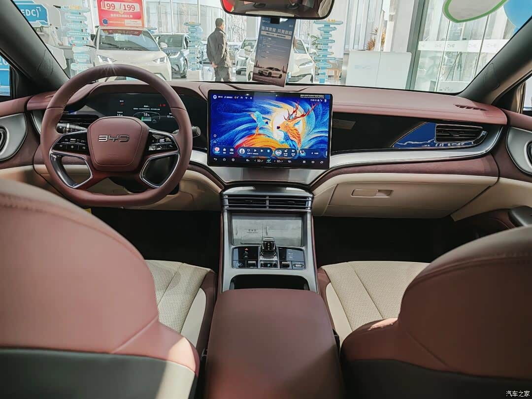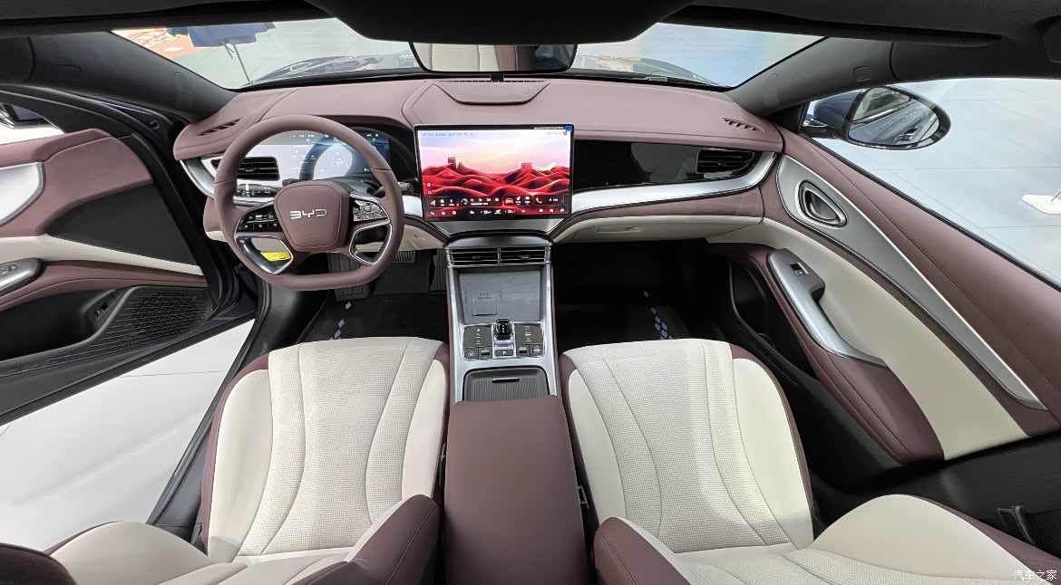 海豹07dmi中控台采用对称式设计,线条简洁流畅,各功能区划分清晰,悬浮式大屏与全液晶仪表盘让内饰的科技感更强,各种信息一目了然,操作丝滑,搭配小巧精致的电子换挡杆,科技氛围浓郁。在用料上更是考究,大量软性材质与皮质包裹座椅、扶手等部位,触感细腻温润,缝线细密精致。