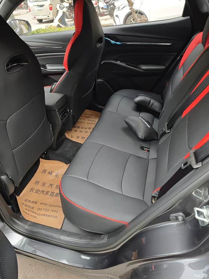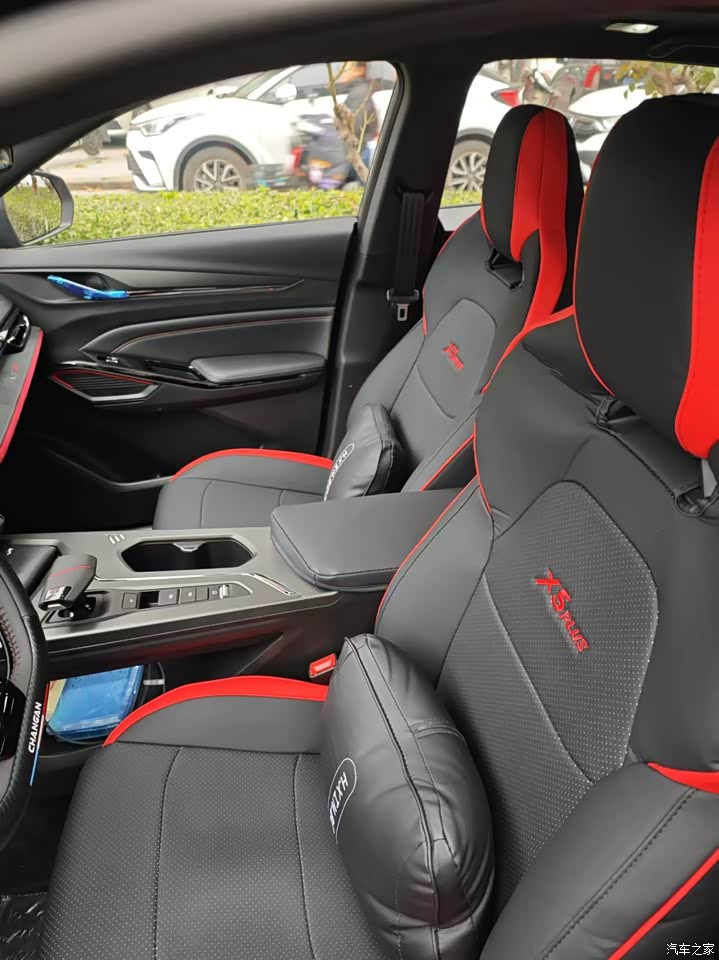 内饰方面,屏幕采用的是三联屏设计,配备双12.3英寸联屏,视觉效果非常震撼,导航、听歌、看剧等功能都能轻松满足.空调出风口下方的一排实体拨杆按键,可以对空调等常用功能进行快速盲操,游艇式的电子档杆设计不仅美观,还使中央扶手区域留出了掏空的储物空间,增加了实用性.车内采用一体式运动座椅,皮质材料拼接红色的仿麂皮材质,营造出了不错的视觉效果和乘坐舒适性.