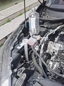 车子买了几个月了,开了4000多公里了,由于新车里面没多少玻璃水,过年之前又一直没有下雨,所以喷的比较多,等到今天里面已经彻底喷干了,没有了,于是拿上自己买的玻璃水,自己给汽车加玻璃水,首先把车子的引擎盖打开,然后用撑杆把它撑起来,找到加玻璃水的盖子,这个情况不能找错哟,这个上面有标记的,要是加到机油壶里面,那就得修车了,准备了一瓶两升的,估计应该差不多,直接给他全部倒进去,全部倒完了之后,发现还不够,于是又拿了一瓶小一点的给他倒进去,大概倒了一半的样子,差不多了,加玻璃水的时候要注意,不要把别的其他的东西掉进去,就是在这里要提一点,有的说直接可以加自来水,我们汽车这个首检的时候,他也是准备给我们加自来水,用倒是可以使用,就是冬天温度低的话,有可能结冰,然后就是有可能堵塞,喷玻璃水喷头的小孔,这样到时候会得不偿失