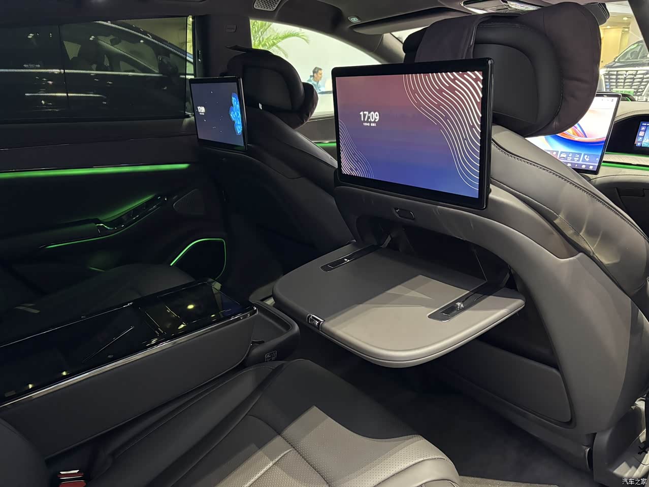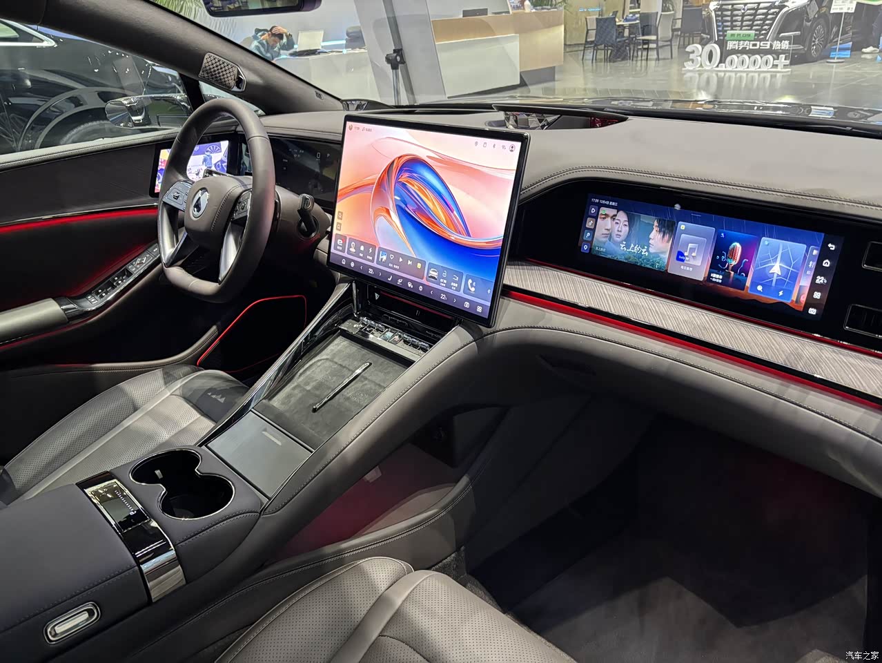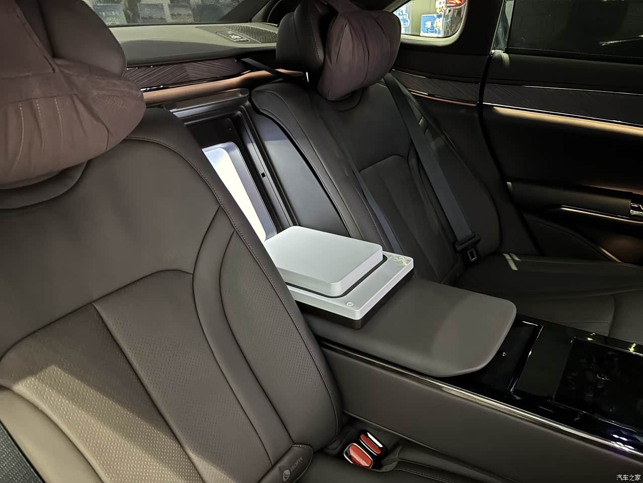 内饰很豪华,真皮包裹以及科技感很强,后排还有小桌板,商务性尽显,后排办公放个笔记本确实很方便。做工质感很高端,中控屏幕也很大,就是车机风格略显老气。