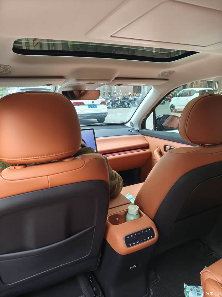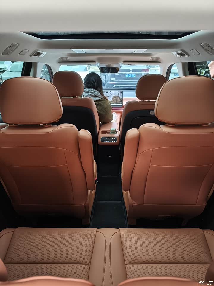 第二排为独立座椅,配备加热、通风功能且支持电动调节,右侧座椅前方还有小桌板,方便闺女放玩具。 第三排坐垫厚实,之前的比亚迪s7三排坐人小板凳太憋屈,而且没有空调。这个配备独立空调出风口和充电接口,虽空间相对较小,但对于儿童或短途乘坐的成人来说较为舒适。 一排1.8,二排1.75米以下,三排1.7以下都没问题。中间过道狭窄,胖的人不好走。