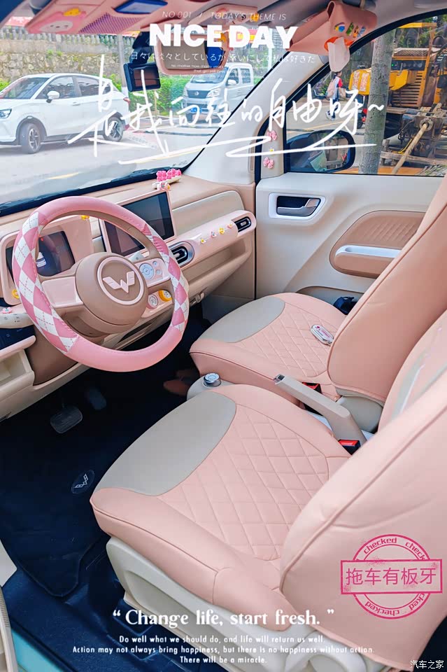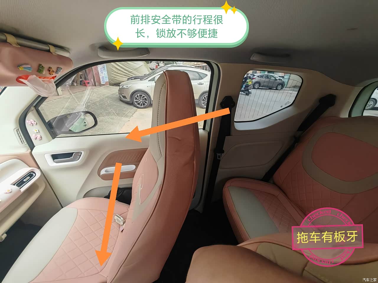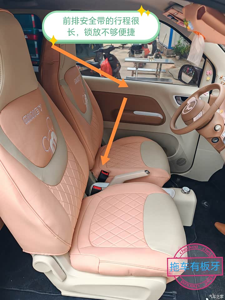 我的这辆马卡龙内饰是棕色和白色双色搭配的内饰,座椅也是这种配色,用的是绒布包覆。为了方便搭理,建议车友们也加一套皮革的座椅套包起来吧!这个双色的内饰倒是让我看起来有种温馨的感觉。不过后期爱人有加了一大堆粉色的装饰。唉!随她吧!她喜欢就好