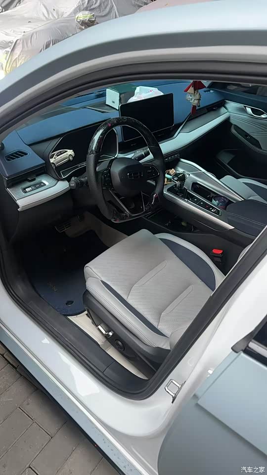 内饰方面,蓝白配的座椅漂亮让人爱不释手,中控大屏加上保留了很多必要的实体按键(空调,前档除雾,后视镜加热,风量控制),既有科技感有实用,还有多功能方向盘上的拨杆,用起来真的是方面又舒服,还不会误触