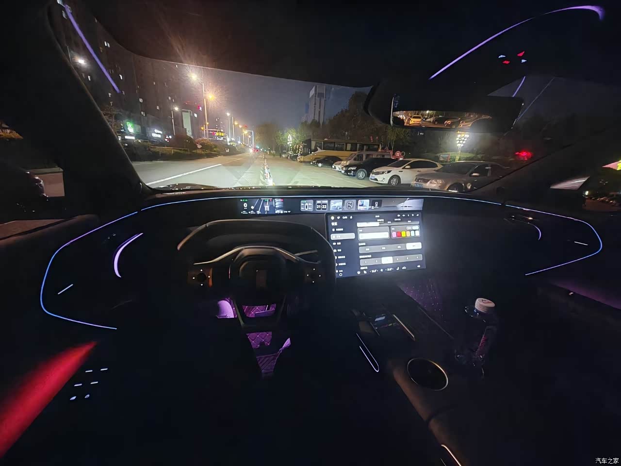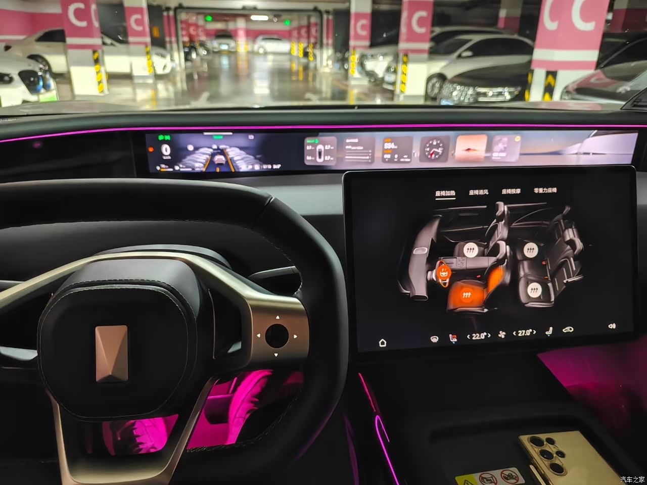 内饰尽显奢华科技感,紫色配色大气亮眼。15.6 英寸中控屏与 35.4 英寸远端屏联动,科技感爆棚。方向盘新颖,换挡便捷。 打孔真皮座椅带零重力功能,通风、加热、按摩全具备,后排扶手功能丰富。 大面积软包材质,细节处真木装饰,美观与实用兼具。