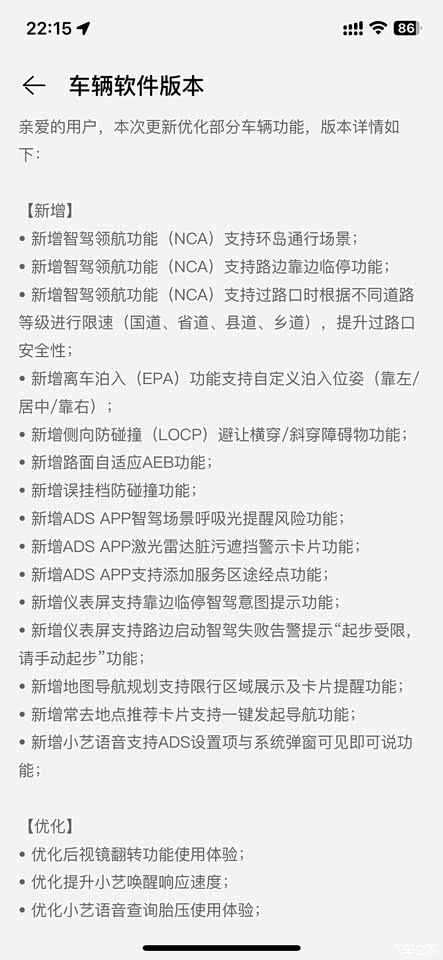 OTA基本稳定在一月一更新的速度,每次更新智驾都会变得更好开,而且还会OTA一些新的功能,像今年O了遥控泊车,离车拨入,寻迹倒车,前后左右防碰撞等等,12月底还会O无人泊车 说说ads3.0的体验:1.变道超车真的非常流畅,以前城区智驾被诟病最多的就是碰到电瓶车自行车不敢超车,只会一直跟在屁股后面慢慢走,必须人为接管,现在在小路上,基本上激光雷达渲染出电瓶车,行人的那一瞬间,系统就规划出了绕行道路,非常果断。 2.加减速体感更流畅,以前2.0版本,突出一个急,加速是油门一下子踩到底,恨不得一下子加速到最高限速,然后路上扫描到斑马线又一脚急刹,生硬的把速度控制在30左右,坐在车上真的吓出一身汗,我得不停拨动拨杆去控制速度才会有一点点安全感。现在的加减速更加军运气,基本上不会让人感到不适