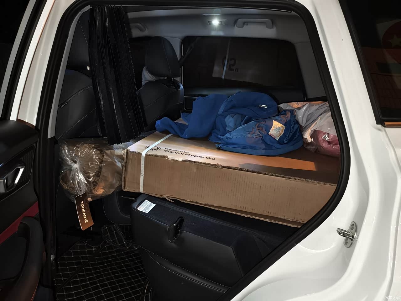我把后备箱垫高,和后排放倒能得到一个接近纯平的大空间,实测刚好能放下一个65英寸的电视,搬家拉货非常实用。后备箱改平后,改成了一个床车,出去自驾旅行可以随时住车上。