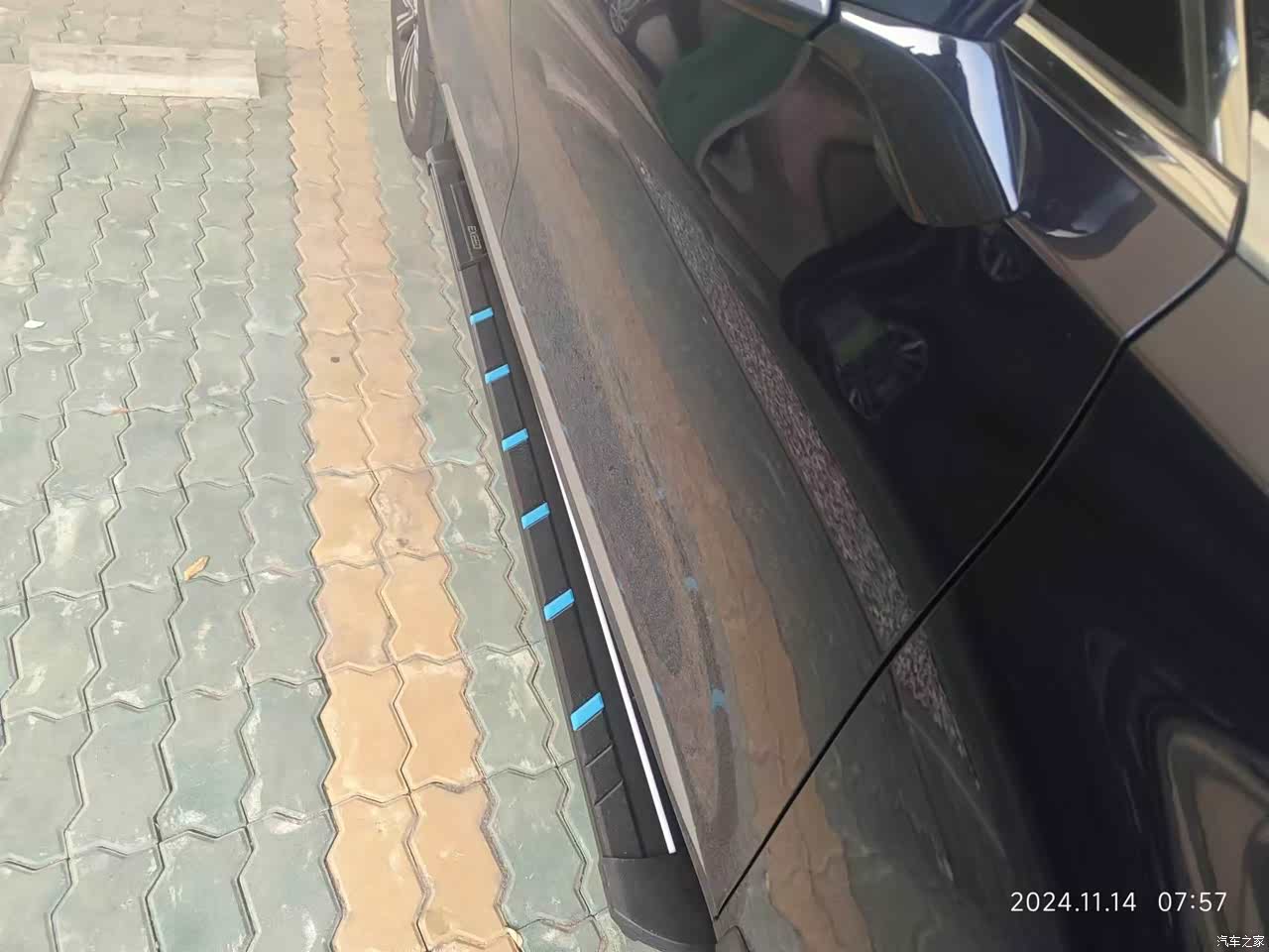 10月26日销售通知我,我的车到店里,总算车到了,等了这么久。星期一请假笔直冲向4S店里。正门口就看到1个两驱深蓝色车停在那里。不用想了这就是我的大揽月了!前脸:采用了大尺寸横进气格栅,粗壮镀铬条,有很强的力量感。格栅上方是一条贯穿式的灯带,与两侧的大灯相连,看上去比23款竖条的要宽不少。大灯组全部LED灯,造型较为犀利。我喜欢25款横条格栅。轮毂:配备20寸的双色铝合金轮毂,中间带星途LOGO,美观大方,彰显我这车高端、大气、上档次,一般轿车停在一起前盖才到我轮胎高,俯视感觉真好。尾翼:尾部设计较为简洁,后贯穿式车灯,与前面呼应。尾翼上方一个刹车灯,大大提升了安全性。唯一遗憾的是这么高的车为啥不带脚踏板呢?外面装的感觉没原装的好。提车第一件事就下单脚踏板,第一小朋友上下方便,第二还可以当保险杠。这就是我选固定脚踏而不选电动脚踏的原因。装上脚踏板这档次又提升好大一截。