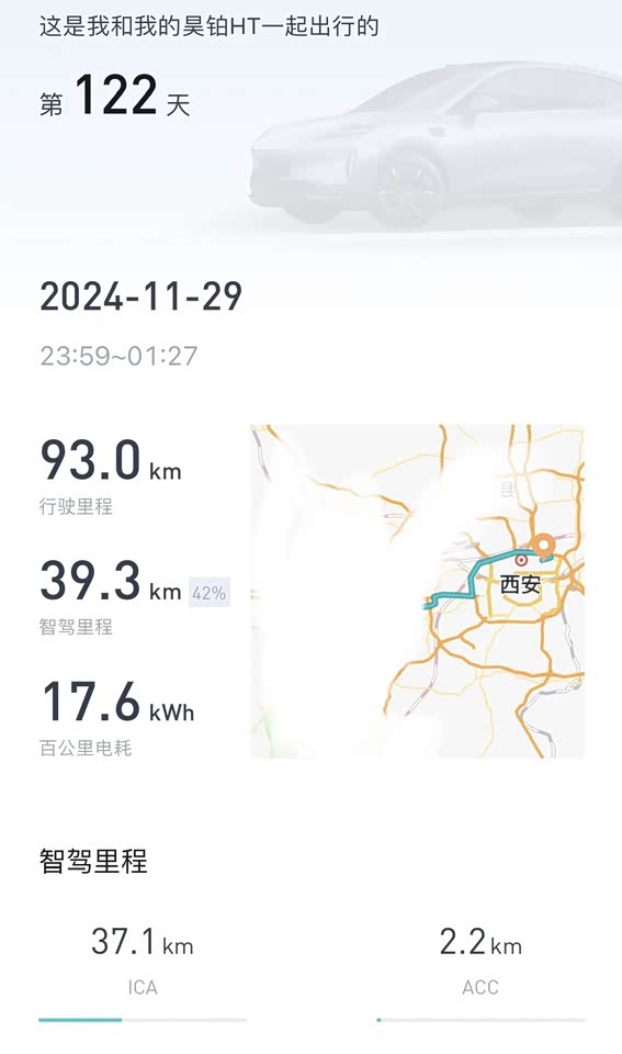 最满意就是用车省心、放心 1.开起来很舒服。我平时用的舒适模式,方向盘很轻,转弯半径5米多,城里道路掉头一把方向就过了;电机加速很流畅,动力随踩随有;底盘反馈很有韧性,过弯舒适;前后都是双层玻璃,低速隔音好,静谧性很不错,高速过了110以后,风噪还是比较明显的;平时开导航、控制空调等等,“你好北鼻”语音小助手很方便。 2.续航里程比较有底气。现在西安气温已经在0度徘徊,舒适模式下,百公里电耗18左右,80度电池,跑400公里还是可以的。不过,家里有家充,我一般晚上就补到95%。 3.充电方便。自家车位很快就装了充电桩,昊铂免费赠送的(30米线,充电桩立柱和本体)。现在基本上每天回家就插上,预约到晚上11点开始充电,享受每度电3毛钱优惠价。 4.销售人员服务态度不错。我是在自营的经销商买的车,他们安排了一对一服务,经常电话沟通,嘘寒问暖很贴心,还经常组织车主一起出游,自驾、玩乐、吃喝,关怀车主;还有昊铂app线上服务群组反应及时,24小时待命,只要有用车疑问,随时问随时回答。 5.L2级智能辅助驾驶让人放心。跑高速很方便,解放双脚,不累。