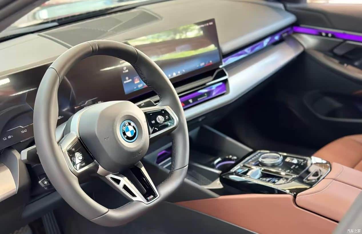 虽说宝马i5的内饰也是当下比较流行的简约风格,但整体完全没有那种网红感,主要还是在用料和做工方面比较下本,再加上中控台上的木纹饰板以及漂亮的氛围灯就很上档次,还有这块大连屏也是很有科技感的,操作起来也比较流畅,语音识别也很精准。