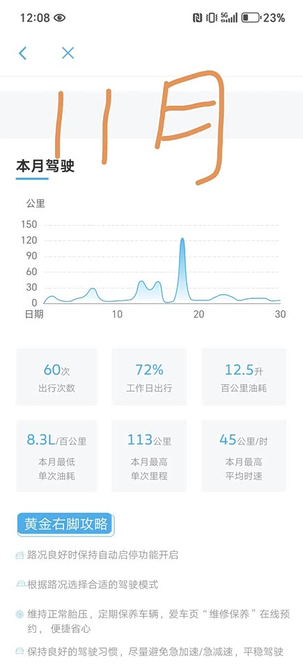城市内通勤,速度提不上来,一走一停肯定费油,本人11月份基本在市内走走停停,一个月平均油耗12.5/100km