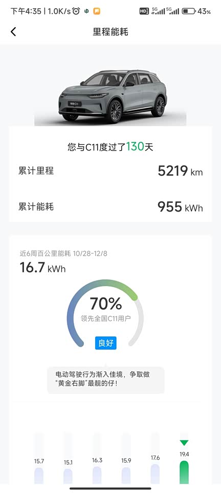 续航一开始觉得有点低,后面磨合了还是不错的,现在基本14-15电耗(这两天开了方向盘、座椅、后视镜加热再加上空调)电耗有点高。