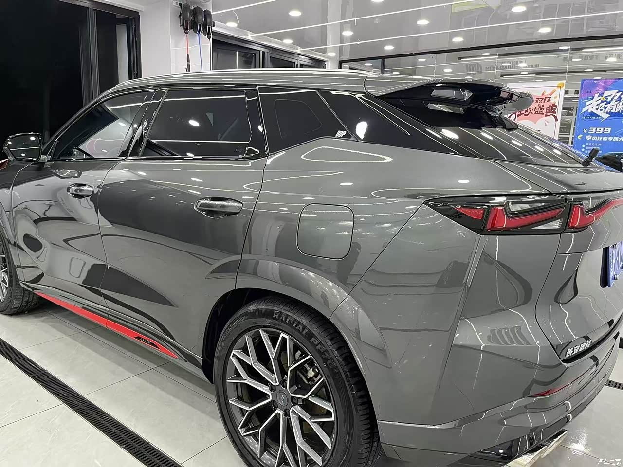 外观不错,我特别喜欢它的镂空尾翼,双边四出排气,还有20寸的大轮毂。