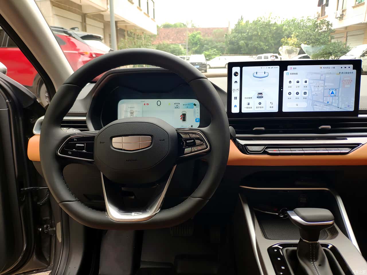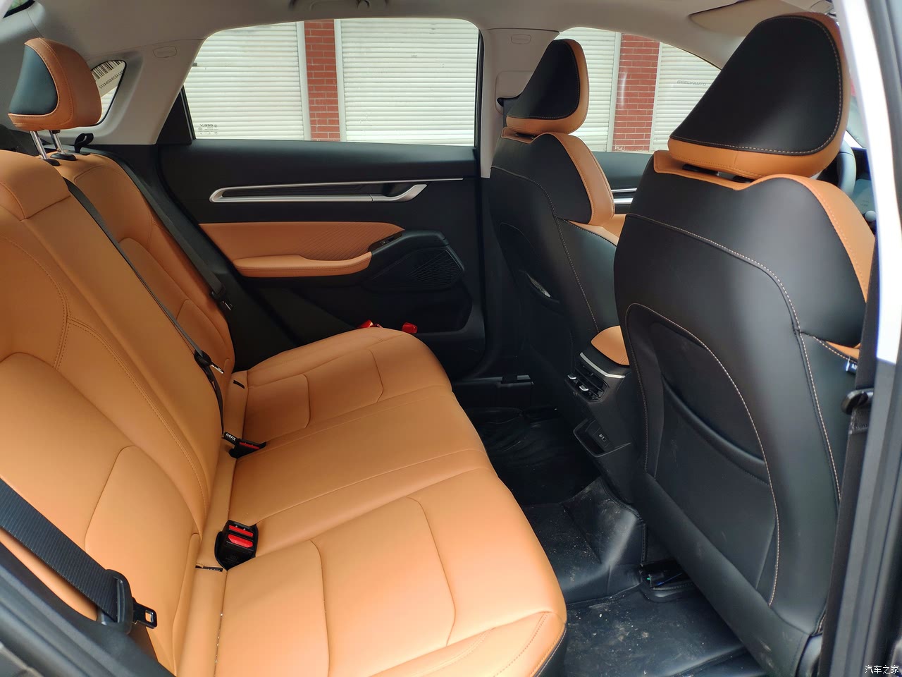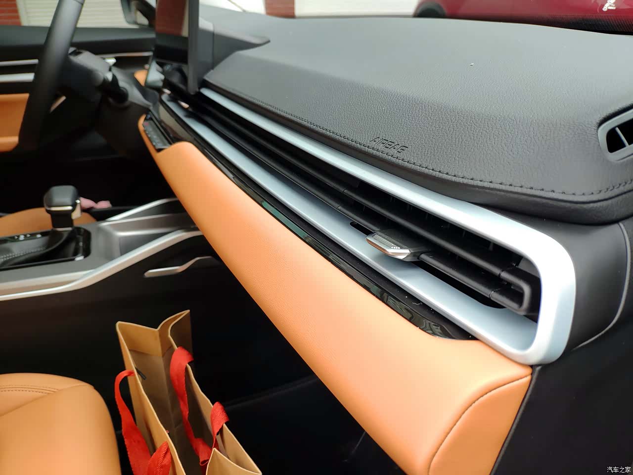 棕黄的座椅颜色,加上黑灰的面板装饰,车里面内饰颜色还是很丰富好看的。空调出风口是一体式的,样子也算好看的。