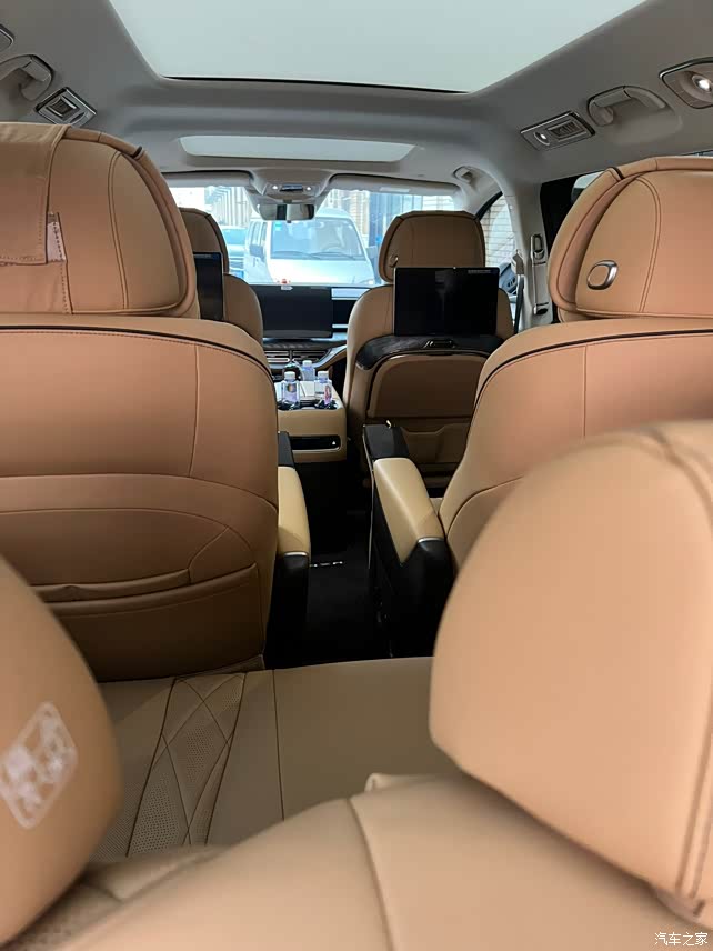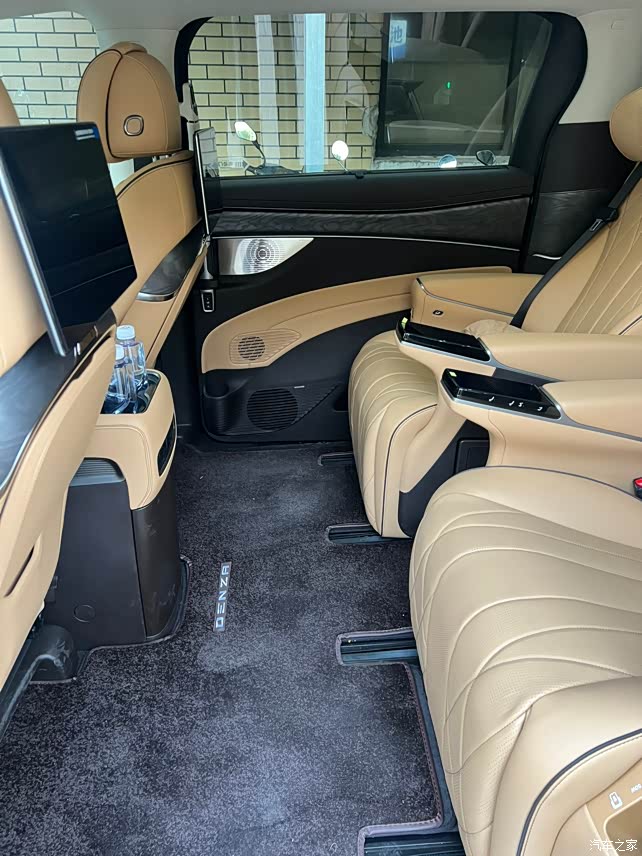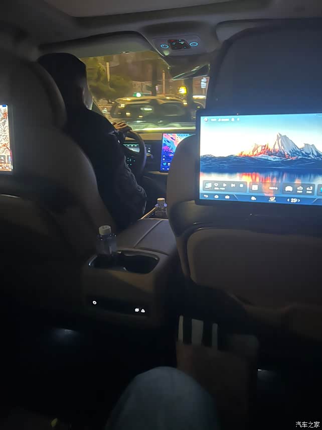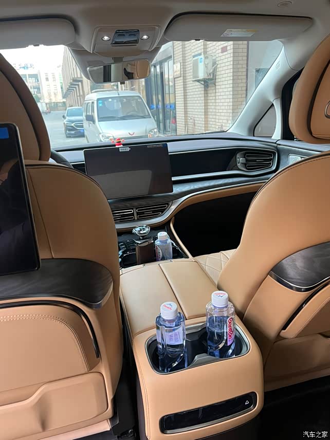 只能说用料扎实,全车真皮材质,中央操控台的位置,按钮也很有质感,整体算简约,就是有些粘指纹。氛围灯的颜色也挺多的,特别是到了晚上,边开车边听音乐,氛围灯会随着音乐节奏跳动和换色。小桌板的设计也是恰到好处,用时放下来,不用时收起来。