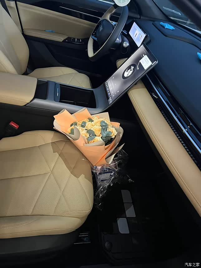 2.5K的大屏幕,看着是更舒服细腻的;网上的测评说塑料感很强,但我觉得还是不错的,我选配的是外白内棕,看着会更加大气。内饰基本都是软包材质,触感中规中矩,门板上和中控台也是软包材质,对我来说质感还是很不错的,我还在两边放上了玩偶装饰。