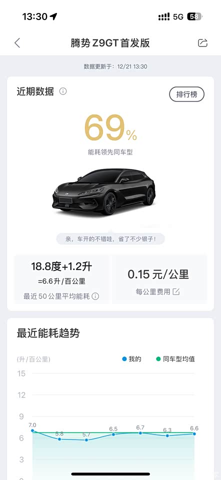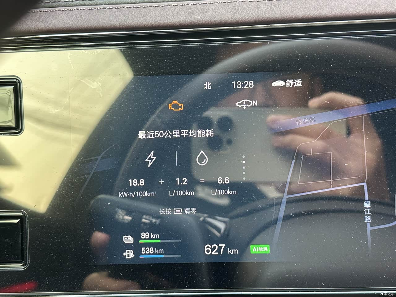 续航能力令人满意。在日常使用中,无论是城市通勤还是长途旅行,它的能耗都相对较低;在混动模式下,综合油耗更是让人惊喜。我行车习惯中,有暴力驾驶,有正常驾驶,18.8度/百公里+1.2L/百公里,这可是一台2.7吨三电机的豪华性能车啊,第五代DM混动专用发动机真牛。