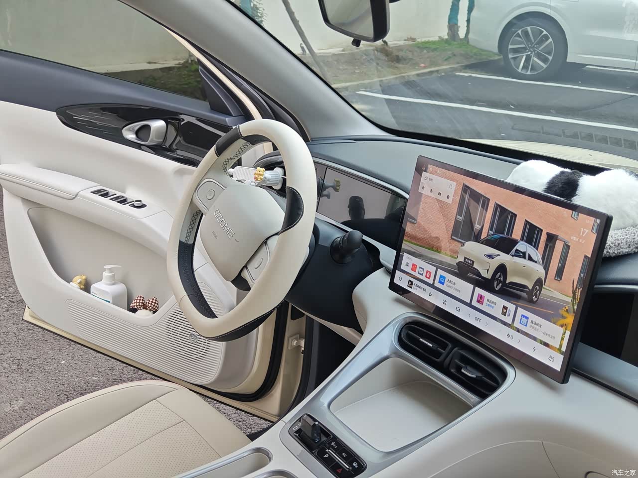 我选的白色内饰,应该不会有人不喜欢这样子的配色吧,灰白相配,非常的高级。不过也有一点点担心白色的不耐脏,所以又单独买了座椅套,白粉组合,给车内的空间又增加了一份色彩。