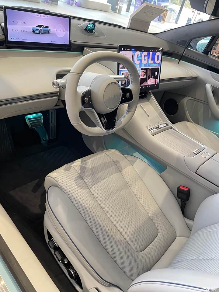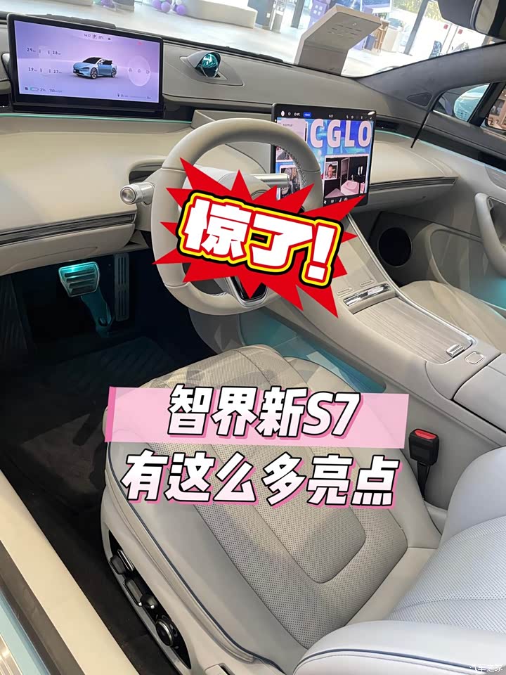 必须是这车的外观,我当天试驾的那款是蓝色的,非常抓人眼球。在店里灯光的照射下,它的车漆流动着炫光,看着动感十足,别看它车头挺大,整个车身看着比例匀称协调。侧面看,车门弧度漂亮,腰线挺拔,智界新S7全身线条丝滑流畅,无论从哪个角度看,都清清爽爽,甚至整车带着活泼劲儿。它的车灯造型,也是个亮点,像蛇的眼睛一样,犀利有致。