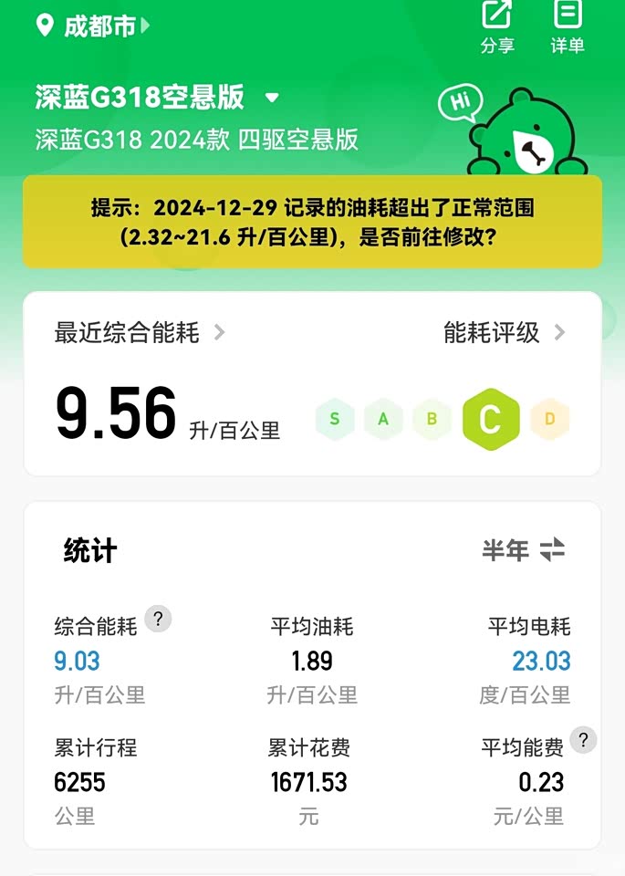 我那辆2.0升自然吸气的紧凑型SUV燃油车已开了11年多,配置不错车况良好,驾驶体验也很棒。唯一的不足就是油耗偏高,高速还好点百公里7-8升,城市通勤要11升以上,每公里花费7、8毛钱还算好的,有时候一元多。深蓝G318自北京车展亮相后,我一直留意着。查看试驾视频阅读车评文章,经过多番对比,排除了理想L6/L7、坦克300/400Hi4t、岚途free和山海等,6月13日G318正式上市,我就首批下单定了四驱空悬版。焦急的等待,爱车终于运抵成都长安交付中心,6月30日车辆整备。由于周末无法打临牌,定在7月1日提车。提车后,我便马上处理了燃油车。 第一眼被吸引就是被深蓝G318方盒子的造型,“赛博金属原石切割”外型设计,高高大大,既偏向科技新硬派风格,车身每一处细节都充满科技感。车辆配备原厂拖车钩与高位刹车灯,进一步保障越野行驶安全。车顶的大灯组,两边2个远光补强灯,中间2个露营灯,是目前唯一合法合规原厂自带的车顶大灯组,特别适合野外探险和露营使用。 车身抗扭高刚性和高科技底盘配置,G318具备更强的越野能力,轻松应对中度越野穿越挑战。前双叉臂与后五连杆式独立悬挂,搭配魔毯空气悬挂和CDC系统,操控性超棒;四驱动力强劲,加速轻快;乘坐舒适,开门时车身还会自动降低,方便家人上下车。无论是川西环线、国道318,还是新疆青海的各种路况,它都能轻松应对。 总之,搭载深蓝超级增程2.0的G318,解决了传统硬派SUV高能耗的痛点,大大降低用车成本;36千瓦金钟罩电组在城市通勤时,纯电里程完全够用,花费也不多;双电机四驱带来的高通过性,结合空悬+CDC,解决了硬派SUV舒适性不足的问题;车内空间利用率、乘坐舒适度、手机快充、6千瓦对外放电等便捷性设计;所有车窗玻璃均为双层夹胶玻璃,带来极好的静谧性,也提供了其他传统硬派SUV无法提供的舒适性。 开了6个月,我十分享受其动力及舒适,完全满足了我的出行需求,也让我对未来的自驾之旅充满期待。相信有了它,定能开启一段美好的新生活。