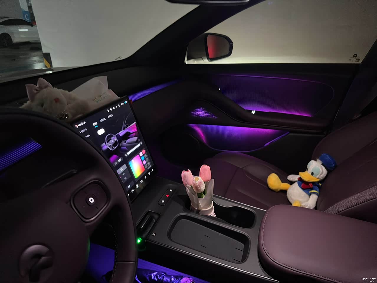 紫色内饰比较耐脏加分项,瀑布式氛围灯氛围感拉满,后面自己买了收盒纳又装饰了一点小物件,超好看,拍照很出片的说~~氛围灯有呼吸模式和随音乐模式,晚上开车情绪价值拉满~