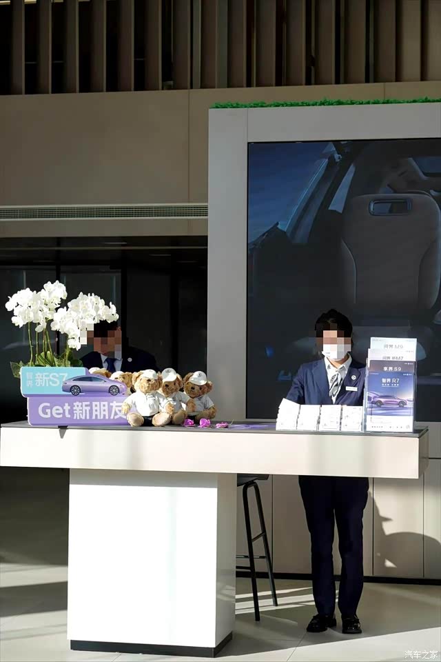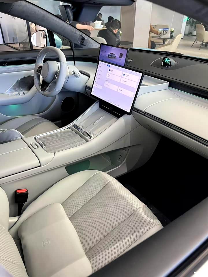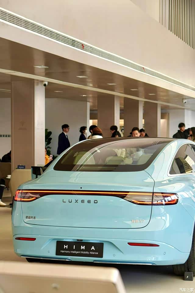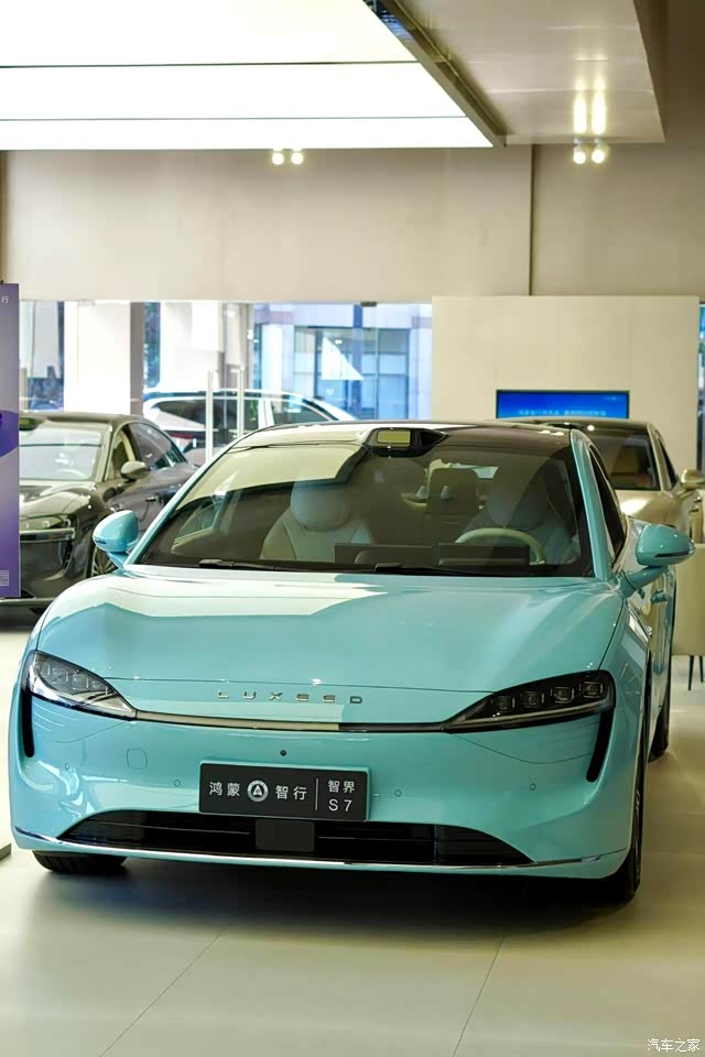 智界新S7造型别致,配色鲜亮,店里的每一款颜色我都很爱,真想全部开回家啊,放在车库里肯定特养眼了,毕竟我是有三个车库的人呀。这车全身线条优美流畅,在店里的灯光下,所有线条都流溢着美感。我相中青色那款了,感觉车漆刷的匀称漂亮。