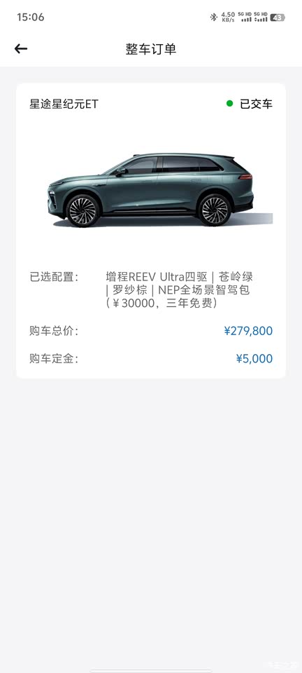 【购车经历】 在购买星纪元et四驱增程ultra版本之前, 对比了智己Is6,极氪7x,以及星纪元et 两驱版本,车都是好车,但是对智己Is6 和星纪元et两驱版本没有遮阳帘不满意. 特别是智己ls6的销售态度,都预约了试 驾,结果到店后销售就失联了,果断删 除所有ls6销售联系方式。极氪7x车不错, 就是四扇车窗全是单层玻璃,我就不明白 了,这么贵的车为什么就不能装双层隔音 玻璃?遗憾放弃。正好这时候,新纪元et 增程四驱上市了,就参数配置而言,补齐 了之前老车主所诟病的各种短板,也比较 符合我心里的预期,就下单购买了。11月 25号下的单,12月20号提车上牌。 【空间表现】对这个车的空间还是很满意 的,车够大,坐在里面也很舒服,座椅的 包裹性也很好,很柔软,就是车太大了, 停车有点不方便。 【续航能耗】 车辆的续航方面,因为我是在江苏不太冷. 基本上也都是零上的温度,开空调还是比 较费电的,充满电大概能跑120公里,能 耗27左右。不开空调,基本上充满电能跑 170公里,能耗21左右。基本上是满能满 足我个人的通行要求。 【智能座舱】 智能座舱表现的还是很好的,毕竟是升级 过了8295p芯片,反应速度很快,也很丝 滑,特别是升级了2.4版本以后。 【充电时间】 充电时间基本上,25%的电到充满45分钟 左右。 【辅助驾驶】 辅助驾驶方面,目前只开了高速noa,端 到端还没开,高速noa在快速路上已经可 以使用了,还是很好用的,自动变道超车 什么的,完成的都很丝滑,让人放心,现 在上班,大概30公里,上了快速路就打开 高速noa,让他自己开,一直开到下快速 路。自动泊车还是很方便的,使用起来也 很丝滑,不管倒车入库还是侧方位都可以 很好的停入车位。 【外观】 外观也还是不错,挺耐看的,就是我选绿 色的有点不耐脏。