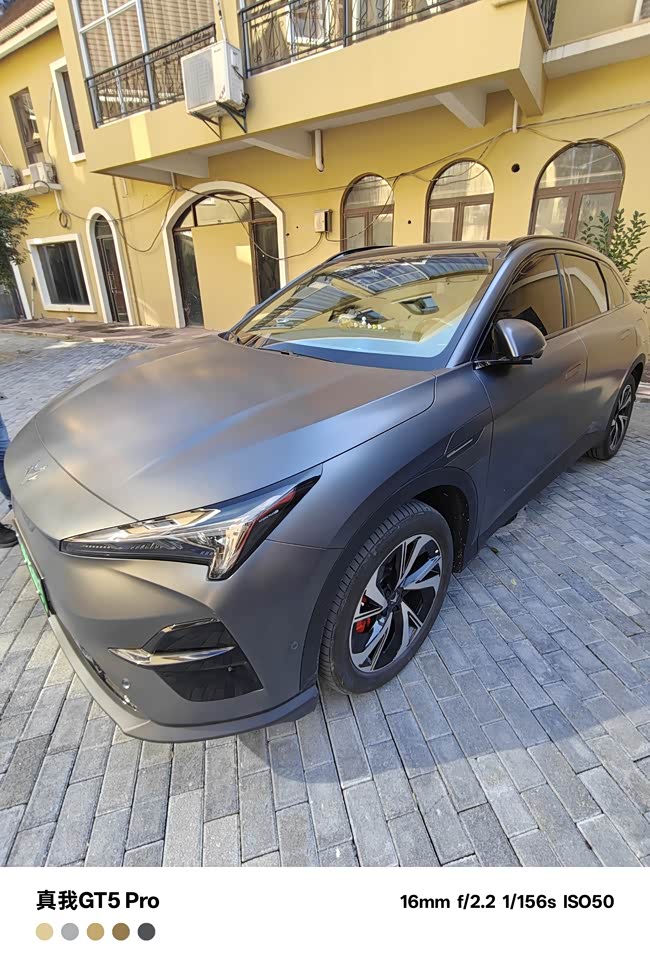 我的24款极狐阿尔法T5海岩灰,外观配置的设计感很戳我: 前脸是“向光而行”家族式设计,全系标配主动闭合式进气格栅,搭配“数字棱镜”LED大灯组——灯组内部是熏黑“鱼骨”纹理,日间行车灯呈贯穿式细灯带,和格栅饰条衔接得特别顺;下包围做了梯形导流槽,边缘还加了熏黑饰条,运动感直接拉满。 侧身是溜背式轿跑轮廓,全系配半隐藏式电动门把手,中高配版本是20英寸“星刃”轮毂+红色卡钳,入门版是19英寸多辐轮毂;悬浮式车顶+熏黑A/B/C柱是标配,车窗下沿的镀铬饰条从车门延伸到车尾,把侧面线条拉得很修长,再加上车身的凌厉腰线,哑光海岩灰质感一下就出来了。 后尾灯是贯穿式熏黑LED灯带,中间嵌入极狐英文标识,灯带内部是分段式光源,点亮后是流水动态效果;尾灯两侧还做了“箭头”造型的延展设计,和车身侧面的腰线连在一起,和下包围的扩散器饰板呼应,整个尾部的辨识度和运动感都很足。
