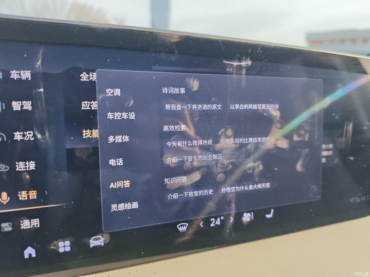 基本上是静态比较多,路上车多,好多智驾体验不了,简单的开了几圈,底盘和插混就是不一样。大家可以去体验一下,两台车都开一下。有语音助手非常方便,几乎不用动手通过语音就可以调节各种东西,导航,音乐,空调,车窗天窗等等,懒人的福音。看电影,追剧,在车上就可以看,前排或者后排都有,怎么方便怎么来(前排大屏幕,开车的时候没法看,只有停车的时候才可以)