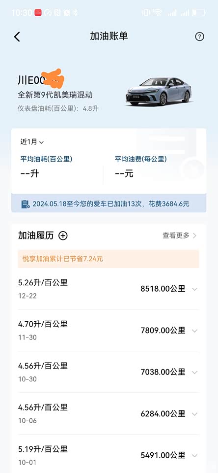 平常用车,油耗基本是一个月加一次,一箱油270左右,850公里左右。