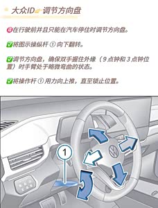 有的时候别人开了我的爱车ID4x,总感觉方向盘位置不太对,开一会就腰酸背疼。其实掌握方向盘调节高低的小窍门儿就能轻松解决这种烦恼。 第一步,我们先找到车辆调整方向盘的扳手。(一定在安全的地方调整方向盘角度。)有一个扳手向下,一般方向盘高低前后都可以调整。我们调整方向盘之前先把座椅前后和靠背调整好,最舒适的状态。方向盘再做调整,这样开车才是最方便的。 方向盘的角度自然是手臂弯曲,不要弯曲太大,方向盘靠胸部太近也是非常危险的。 把方向盘调整到最舒适的状态,然后再把单手锁回去,这样方向盘就稳稳的锁到我们想要调整到的位置了。方向盘在最舒适的位置开车感觉舒适感直线上升,一点儿也不腰酸背疼。 虽然只是一个简简单单的小方向盘,调整的方向也非常的有讲究。你的爱车方向盘会调整吗?调整到最舒服 最安全的状态,才可以有一个非常好的驾驶舒适性呦。