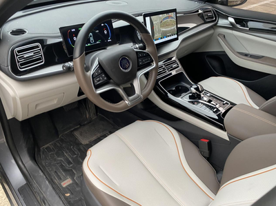 内部设计简约,没有太多时尚的东西,材质做得也不是很好,用的材质感觉太塑料感了,后台设计还是可以的,干净清爽,而且中控屏幕非常灵敏,尺寸也是比较大的。