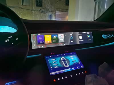 车子的内饰给人的感觉还是非常有科技感的,算上这台12.3英寸的液晶仪表,车内也有三块屏幕,看起来也比较协调,这块中控屏幕的尺寸达到了20.3英寸,而且也是这种宽屏设计看起来确实很有个性,而且使用体验也很不错,下方的这块10.1英寸中控车机也非常好用,主要也是用来控制车辆的一些设置以及空调控制等等这些常用的功能,可以说两块屏幕的分工还是很明确的,操作起来也十分方便。