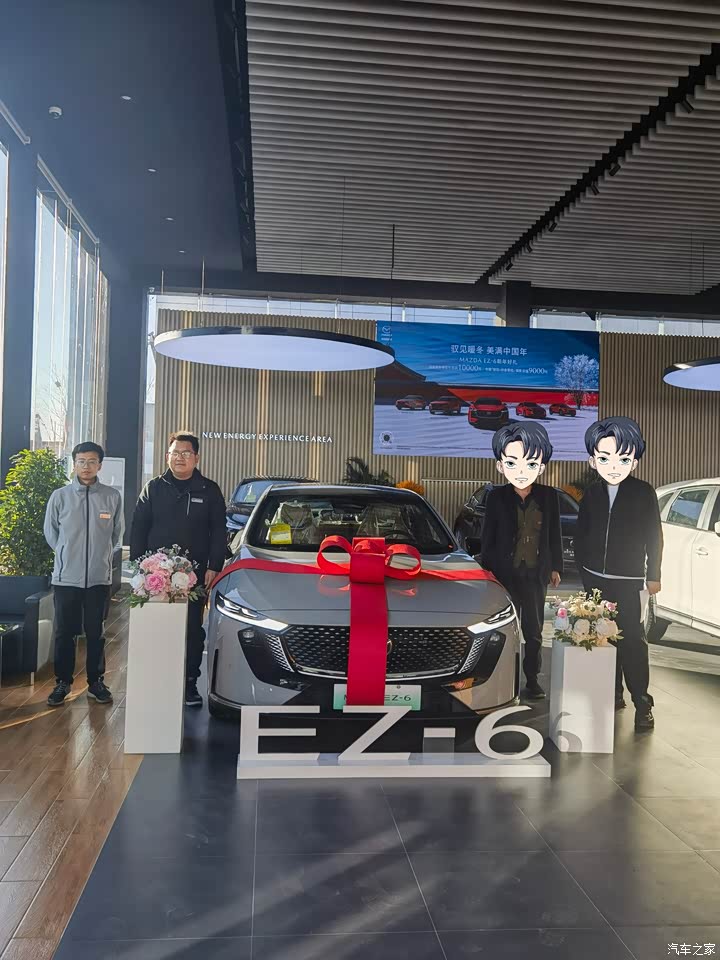 自从马自达EZ6上市后就一直关注,之前有一台马6,一直很喜欢马自达,1月初在店里试驾了一次,1月12号订车,刚好店里有朗月灰现车,现车显得很有档次,很大气,家人也都很满意,就定了。 确定提车日期到店后,车辆已清洗干净。检查了车辆外观,查看是否有划痕、磕碰等瑕疵,同时检查了轮胎、玻璃等部件是否完好。 店内举行了简单的交车仪式,有鲜花,还拍了合影。 从车辆到服务我都比较满意。