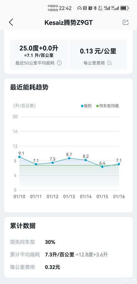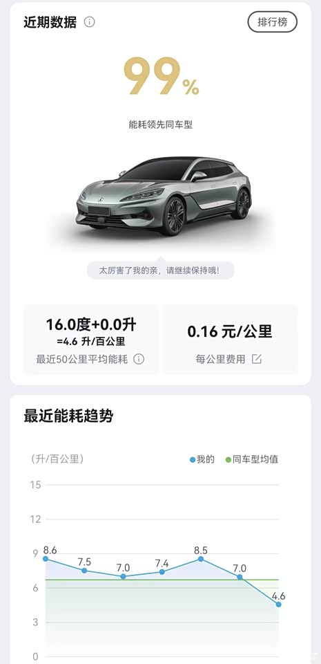 是在最近冬季里提车,实际的纯电续航我还没有正式的测试过,但我平常城区行驶大概可以用2-3天,一般用到15%或者20%才会充电。毕竟买的是插混,能用油,没必要一直在意纯电少的一、二十来公里,而且现在还是在冬季,我个人觉得我自己是够。要是是你是一天一百来公里的选手又不想加油,可能会导致每天都要充电,这样麻烦何必只用ev模式呢,hev就能大大改善虚无镖渺的''里程焦虑''。 查看腾势的app我开的累计的数据,每公里费用是0.32元,这个2.7吨车加上我这个百多斤的驾驶员,时不时还要带一两个人。比我自己500排量的摩托车还要省点(摩托车百公里费用0.45元)果然电车还是要省下不少。当然我没和其他的同类型的新能源进行比较,因为我也是头一次接触新能源,只能和油车相比。比如我家里2019款的c260l,油耗在9-11个左右,折中算每公里的费用大概是0.92元(+95的油每升算的8块钱) 并且比亚迪的插电混动能吃粗粮也能品细糠,能加92也能加95,要是一直加92也能省下有些。我是听车友说+95的油发动机声音会小点我就现在一直加的95。 我开车的脚法也不太稳定,喜欢开快车,所以基本上我的纯电电耗是可以轻松上20个的,但也有开得很稳的情况(开的智驾也会帮我稳成老师司机的脚法),电耗是可以下降到16个的,可能是因为带下坡多一点。毕竟我的使用环境在重庆上坡爬坎起伏较多很正常。但我有其他地方的群友脚法特稳电耗也是控制在17个左右。 从15%左右到100%,比亚迪送的7kw家充可以4、5个小时充满,也就一晚上的事。 在外面使用快充15%左右到95%(在外面使用快充我一般不会充满,可以保护一下电池的寿命),充满时间大概是30分钟-45分钟(车机上下个金铲铲,差不多打一把电都基本上充好了),期间平均最高峰值输入是在84kw左右。有一次我也在外面感受过89kw的最高峰值,不知道是不是充电桩的虚标。