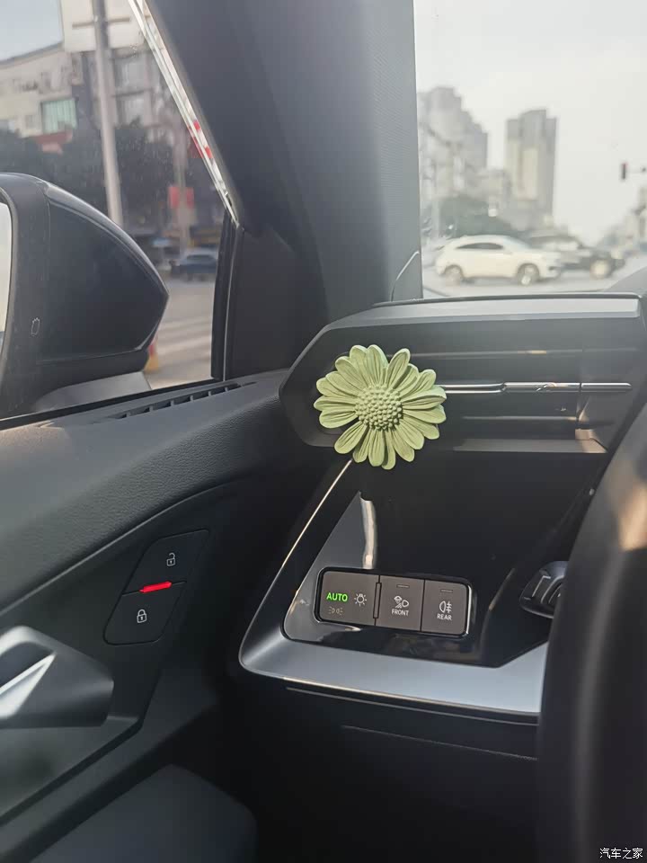 内饰超喜欢呀,线条灯很好看,实体键用着也很喜欢,还给配了一个朵绿色小花!