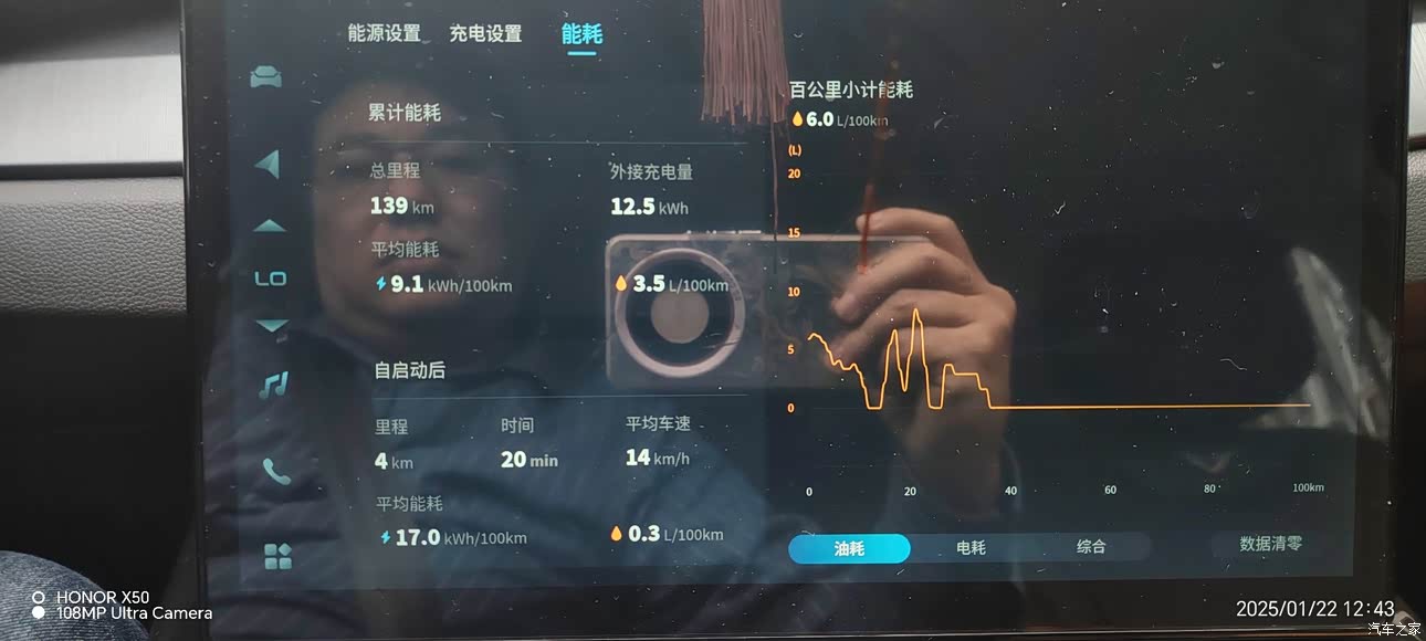 可能是南方的原因,气温18-23度,市区三环快速路60-100这样的速度区间的,强制EV,可以跑130公里剩余10%电量。