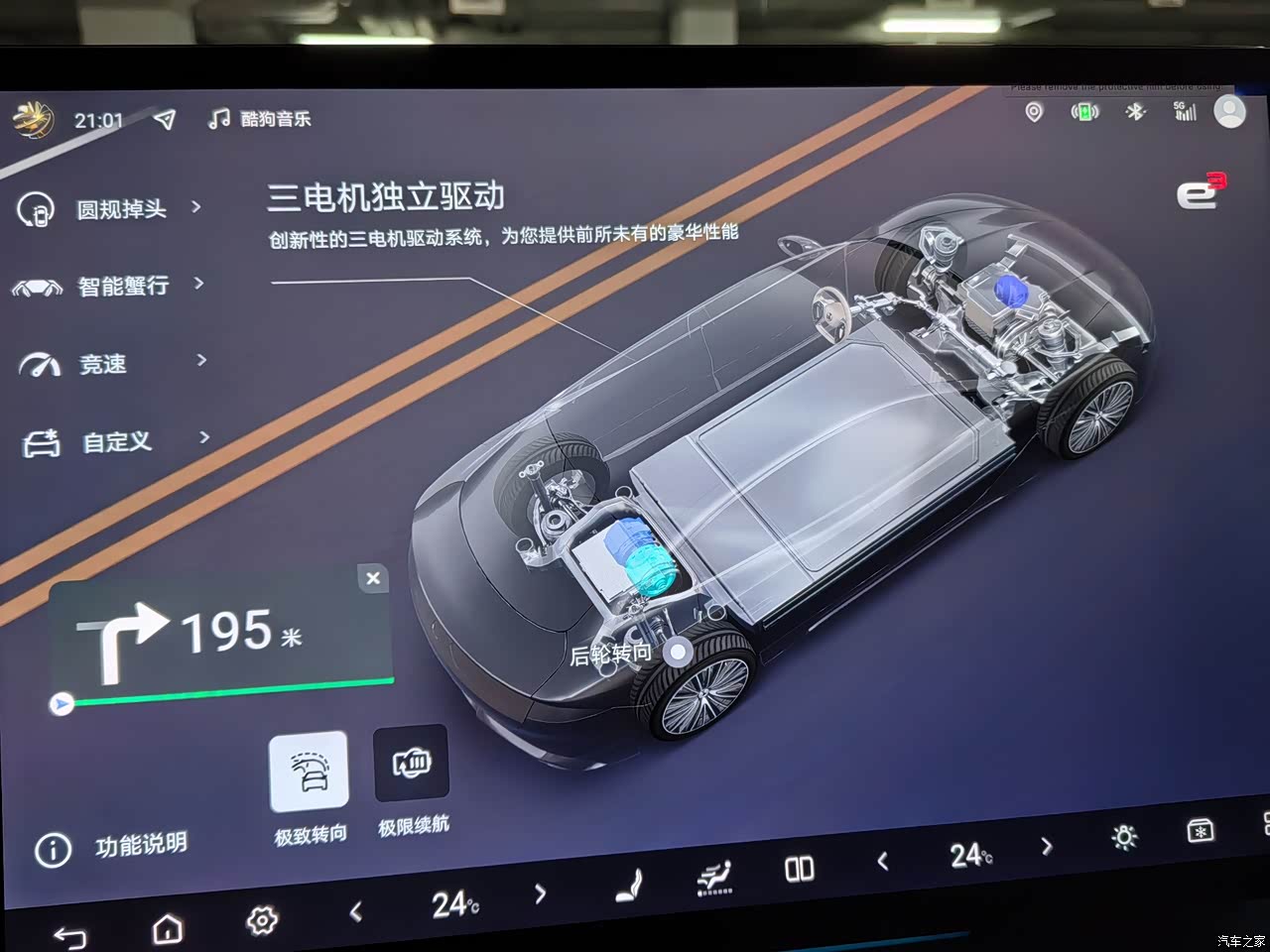 云辇-A悬挂+后轮转向:高速稳定性强,底盘“吸地感”明显;低速灵活,特别是这个转弯半径比我的奔驰C还小,窄路掉头轻松。 转向反馈:方向盘轻盈精准,但在环氧地坪上打大方向的时候,后轮转向声音还是比较明显。