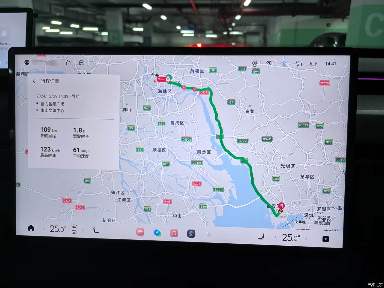 12月29号跑了一趟深圳,单程109公里,出发前充满电至90%,当时气温18度左右,由于衣服穿得太多,开了17度空调,同时全程开蓝牙连接手机播放音乐,车速在100公里左右,一直用纯电优先模式驾驶,全过程增程器没有介入,到达目的地电量余下26%,再次充满90%显示充了25度电,如图。