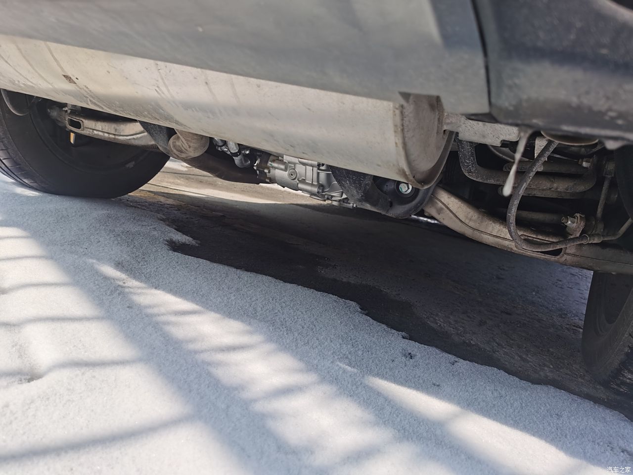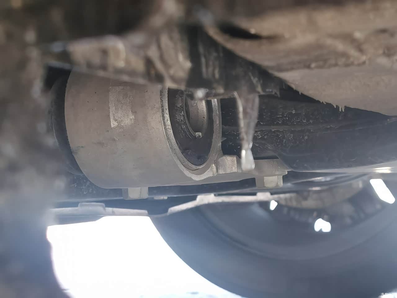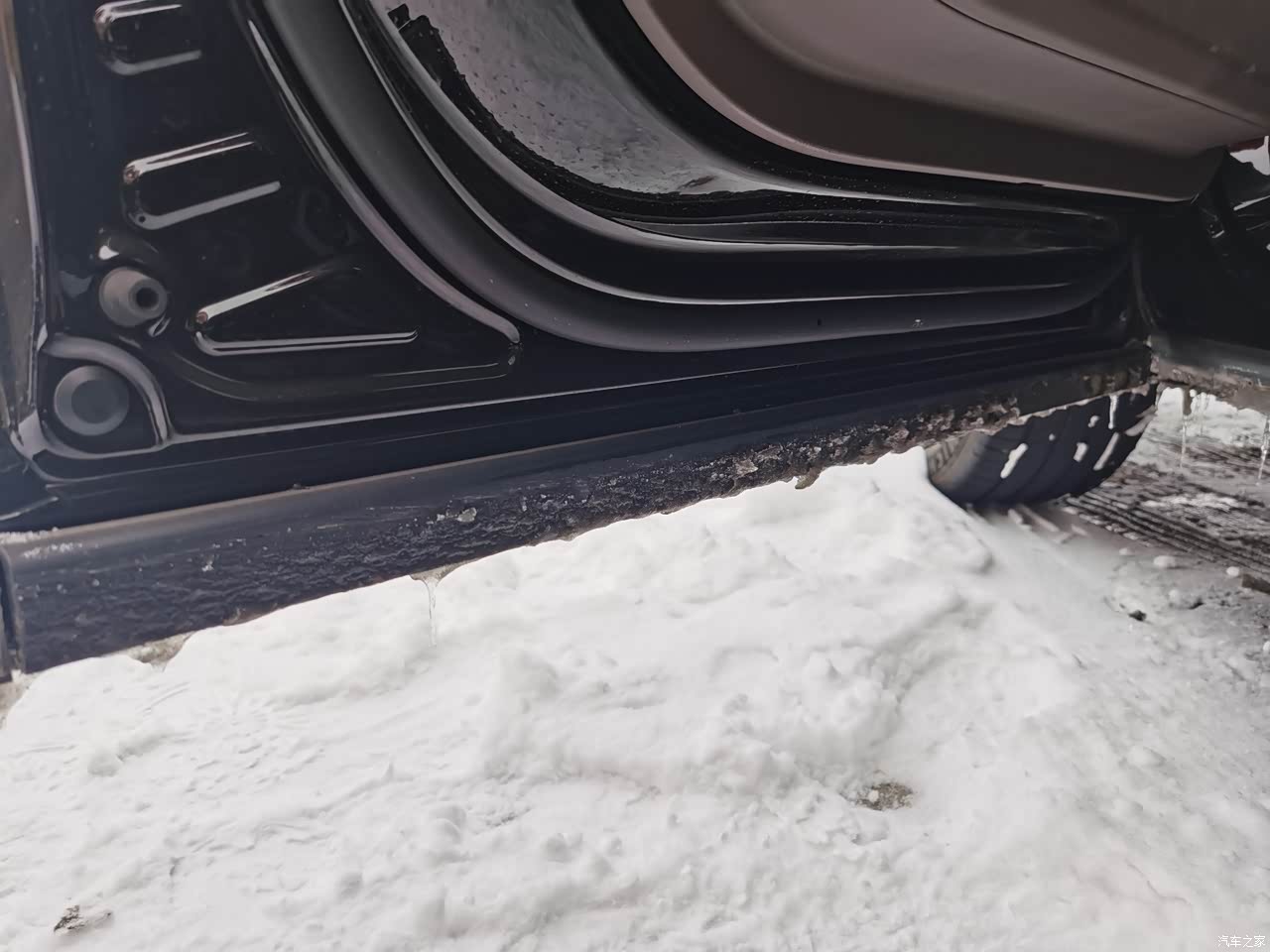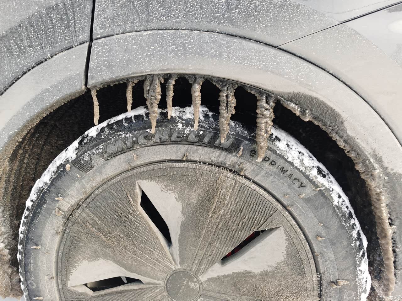 底盘上那两片硕大的白花花H臂后悬架是让我买这车的一大原因,还有粗壮的铝壳液压舒适衬套,我会时不时弯腰去看底盘下面的悬架和衬套,感觉看它们也是一种享受。 这辆车的底盘给人最大感觉就是紧致与滤震都不错,给人很有高级感,加上cdc和不错的悬架还有车重,让人驾驶起来很有安全感,过弯有信心侧倾小。全程馈电和图片上的ct5一起跑高速根本不落下风。轮毂结冰的那张照片是记录一次在高原上冰雪天气下原厂胎跑的,看看轮胎轮毂盖沧桑的冰就知道那天路况恶劣了,这种路况只要开雪地模式稳如老狗。