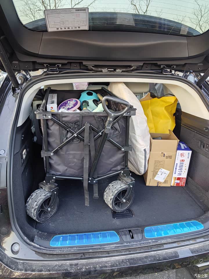 后备箱还是非常能装的,营地车直接推着就进去了,非常适合出去露营,然后后备箱还可以再把折叠自行车扔进去,这样全家人出去骑行一车就搞定所有了