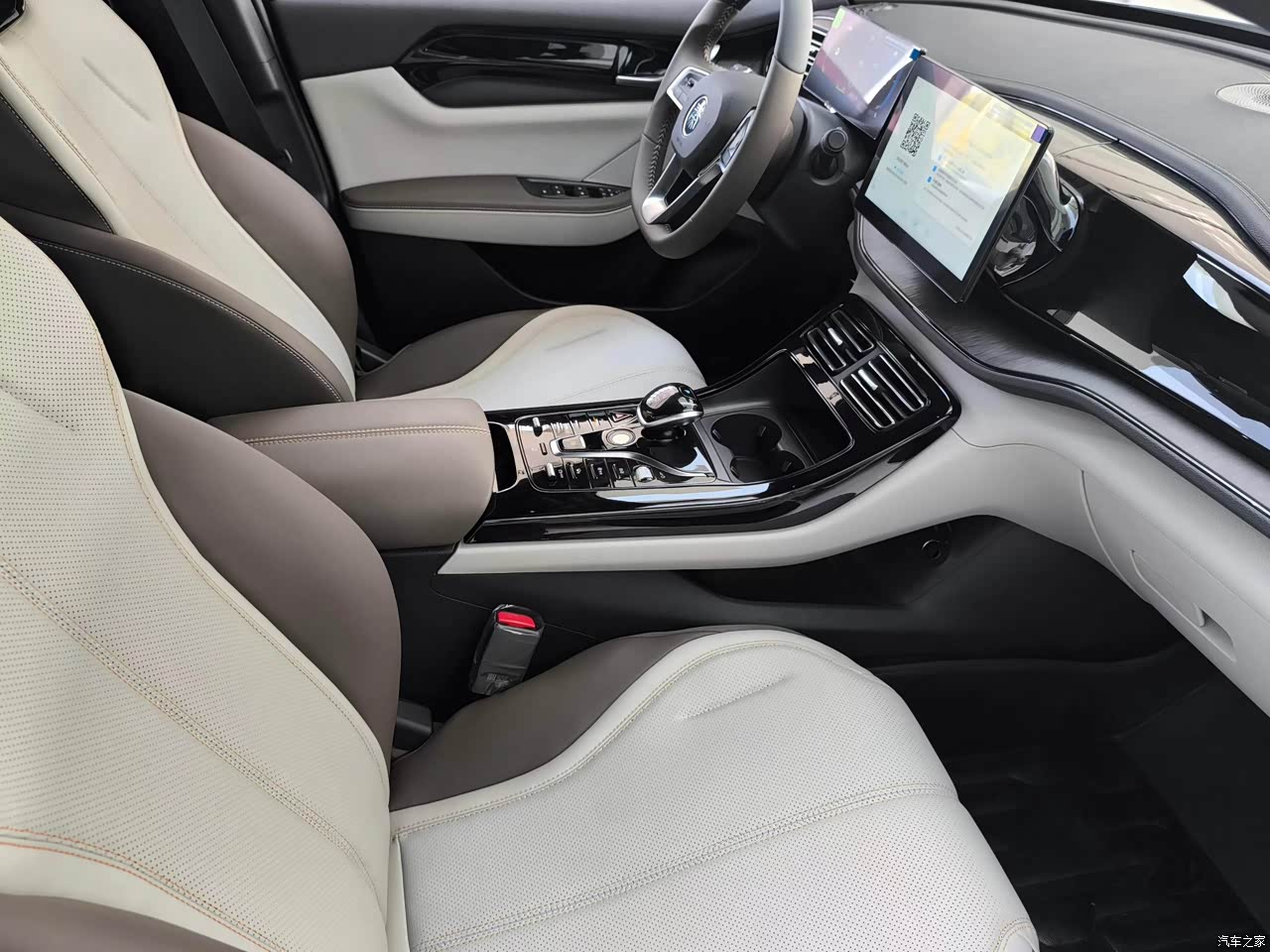 它的内饰就比较一般了,颜色也是那种浅色跟深色的撞色搭配,相对来说还是比较耐脏的。但是他车前面的那些钢琴烤漆的材质,我就不是很喜欢,因为是那种透亮型的,但凡有一点点摩擦刮痕就会很明显。而且很容易留下那些指纹印。