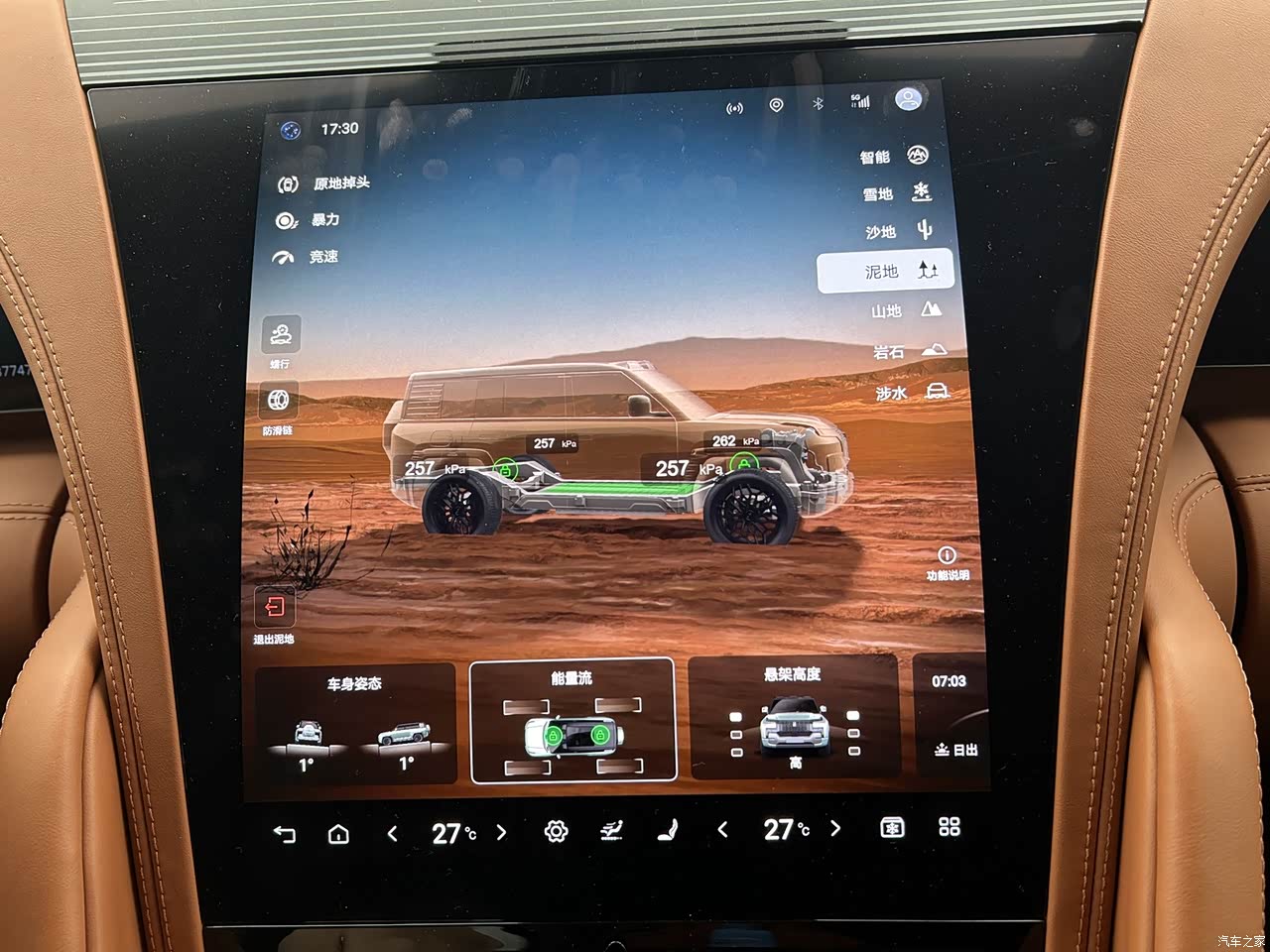 带差速锁,越野脱困十分轻松。可变悬架功能很好用,支持高低软硬调节。大屏很智能,支持语音识别控制。副驾娱乐屏很不错,旅途上打发时间很方便。
