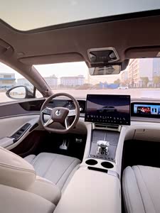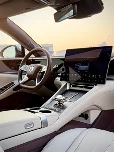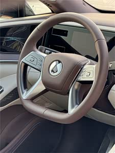 我感觉这个车内饰的用料和做工都很好,看过去整体的布局清晰简单,能够带来很好的舒适感,方向盘采用的是皮质包裹的,开车时的手感更好,13.2英寸的全液晶仪表盘,显示效果清晰,在信息方面也较为全面,中控还悬浮着旋转大屏,配备了高德地图,语音识别功能也很精准。