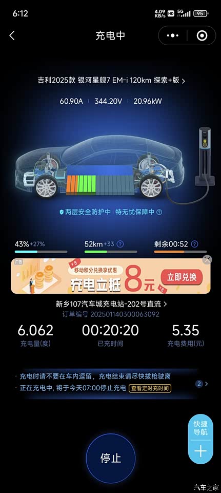 吉利银河星舰7EMI 120+探索版用车体验:一辆改变生活的新能源座驾 作为人生中第一台真正属于自己的车,我在今年1月提的这台吉利银河星舰7EMI 120+探索版,彻底改变了我对出行的认知。这款搭载吉利最新雷神混动系统的插电混动车型,在实际使用中展现出远超预期的产品力。 动力与续航方面,官方标定的WLTC纯电续航101公里和1300公里满油续航的组合,在实际使用中确实经得起推敲。每天的30公里通勤,即使开启空调,实测纯电续航也能稳定达成95公里左右。周末和同事去新乡郊区自驾时,特意测试了综合续航:满油满电状态下连续行驶了820公里(表显剩余续航里程168公里),按照我的驾驶习惯(能量回收开至自动),这样的续航表现完全能满足我的出行需求。 相较于父亲那台2012款手动挡福特福克斯,这台车的智能化程度堪称跨越式升级。最让我欣喜的是自动驻车功能,在早高峰的路上,再也不用频繁踩刹车保持车辆静止。特别是能量回收系统的细腻调校,即便将回收力度调至最强档位,也不会产生让人不适的拖拽感。 充电经济性方面,这台车确实让我尝到了新能源的甜头。公司园区1.2元/度的充电桩,配合预约充电功能(利用夜间谷电),单次充满成本不到15元。按每月通勤22天计算,电费支出仅165元左右,而之前开燃油车时每月油费至少需要600元。不过没有固定车位带来的充电焦虑确实存在,现在每周需要专门抽时间去公共充电站补能两次,这也让我开始考虑租用小区共享车位的可能性。 空间设计上,大轴距带来了越级的乘坐体验。最惊艳的是后排座椅放倒后的纯平空间,实测纵深达到183cm,配合网上定制的记忆棉垫,完美解决了午休难题。后备箱底板下的隐藏储物格设计非常贴心,可以整齐收纳随车充电线和应急工具。 外观方面选择的流月银车漆在不同光线下会呈现微妙变化。内饰的秋韵棕配色比宣传图更具质感,营造出30万级车型的豪华氛围。相比试驾过的比亚迪宋PLUS DM-i,座舱更注重驾驶者的人机交互,,让行车信息获取变得优雅从容。 经过一个多月的使用,这台车带给我的不仅是出行方式的升级,更是生活半径的拓展。周末可以毫无压力地往返老家,节假日带媳妇儿自驾也不再纠结油费成本。唯一的小遗憾是快充功率仅支持到33kW,在公共充电桩补能时相比纯电车型稍显劣势。但对于现阶段的新能源用户而言,星舰7EMI在续航、空间、智能化方面展现出的均衡实力,确实堪称混动市场的标杆之作。