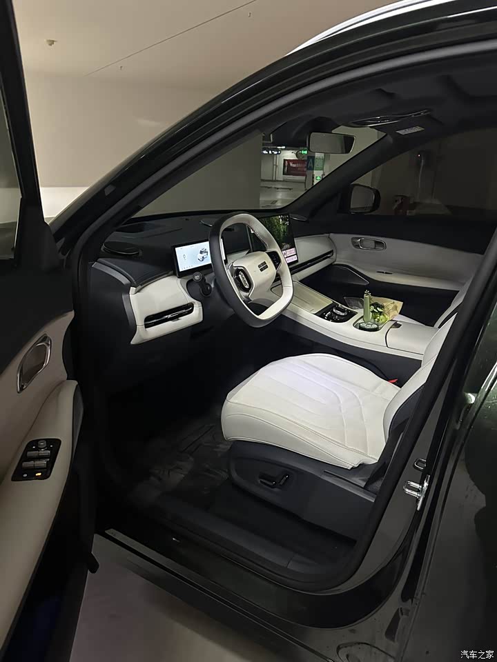 内饰选了白色,看起来干净又高级,质感也很不错。中控台设计简洁大方,用料扎实,摸起来手感很好,整体豪华感说不上,但是还是蛮精致的