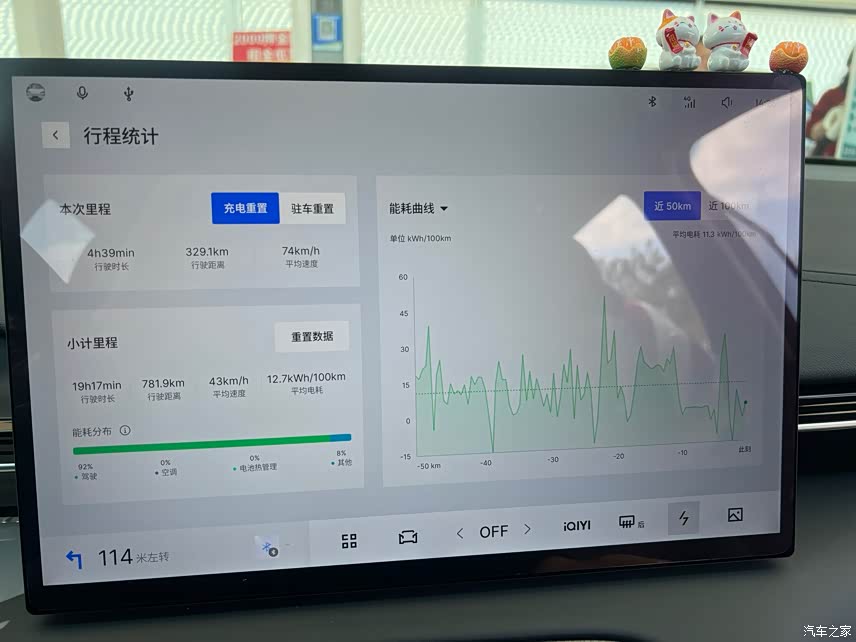 春秋天气市区拥堵路段,车机多媒体音乐或者视频打开的情况下,能耗显示百公里12左右,车辆的续航可以达到公里500左右,高速行驶定速在100公里每小时,能耗百公里显示15左右,算下来可380公里左右。总体上的续航还是比较满意的。冬季本地温度都在0度以上10度以下,不开暖气的情况下,还可以做到百公里15左右的电耗,续航可以达到400公里,开暖气的情况下,续航减少的就比较明显,6折左右。夏季高温开空调续航百公里能耗在14左右,满电可以开430左右。