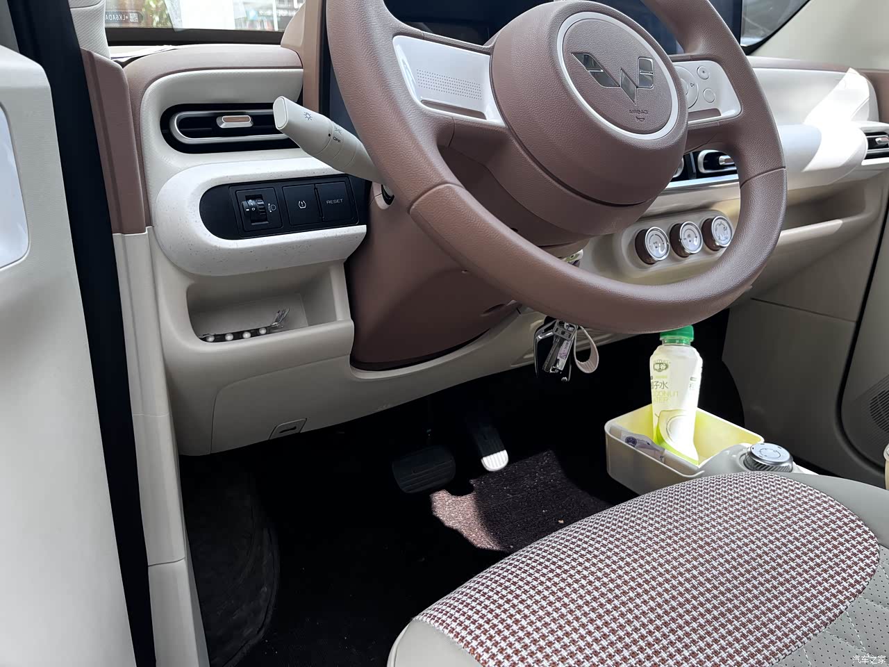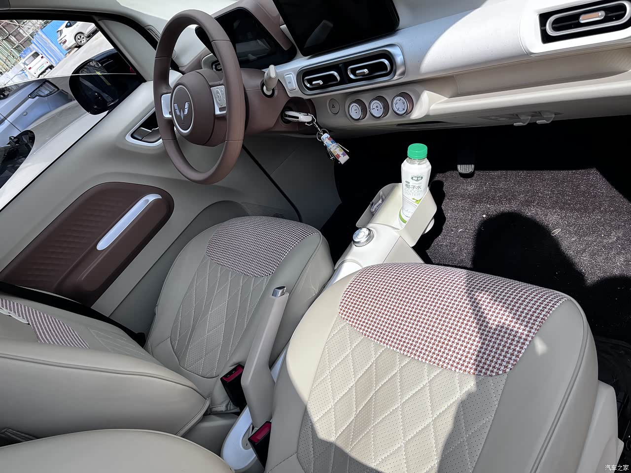 内饰的用料也就一般,车内的颜色有深色浅色两个选折,选的浅色内饰,座椅不是很好打理,自己从网上买了坐垫套来套了一下,比较耐脏,也好打理。座椅只能前后调,不能调高矮,这就比较不方便,矮个子的可以垫一个坐垫,也还行吧。