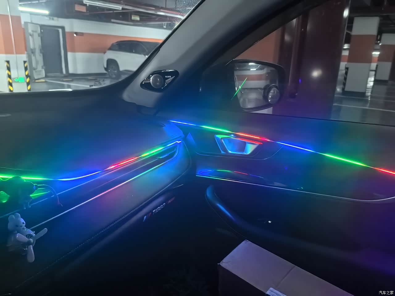 这辆车最不满意的就是车辆大灯,都什么时候了,大灯还不带透镜,照出来都是散光,平时在家里路上晚上跑慢点还行,后面因为要出差去外地,经常几百公里,晚上还要跑,所以考虑来考虑去,觉得为了自己家人,为了路上他人的安全还是把大灯换掉吧,就这样在某宝上和几个同款车友一起团购了这款带透镜的车灯,后面找师傅花了六七个小时才算换好,以后再也不怕路上车灯散光了,再说车内的氛围灯,当时没仔细看,车开回家后打开真的像萤火虫一样,媳妇说感觉有没有一样的效果,后面联系了一个卖氛围灯的车友,买了一个可以调节亮度的氛围灯重新安装上了,大家可以看看上图对比一下