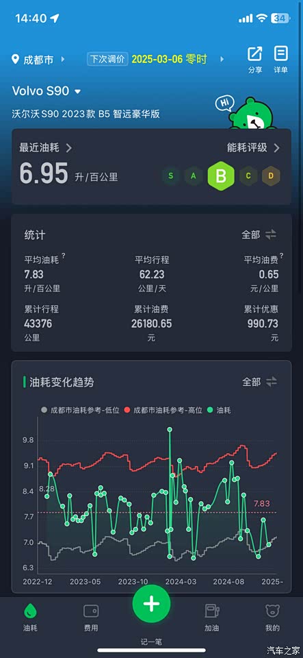 目前里程584km,油耗8.6,大部分都是通勤路段,所以油耗不具参考价值。按理说会比S90油耗更低,7-8之间应该没有问题。但是有一说一,在路况好的时候我也观察了这个油耗,似乎并不会有网上说的那样省油,在乎油耗的车友请放宽心态,做好心理准备,哈哈。